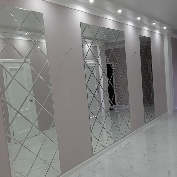 Использована серебристая квадратная зеркальная плитка размером 18х18.
